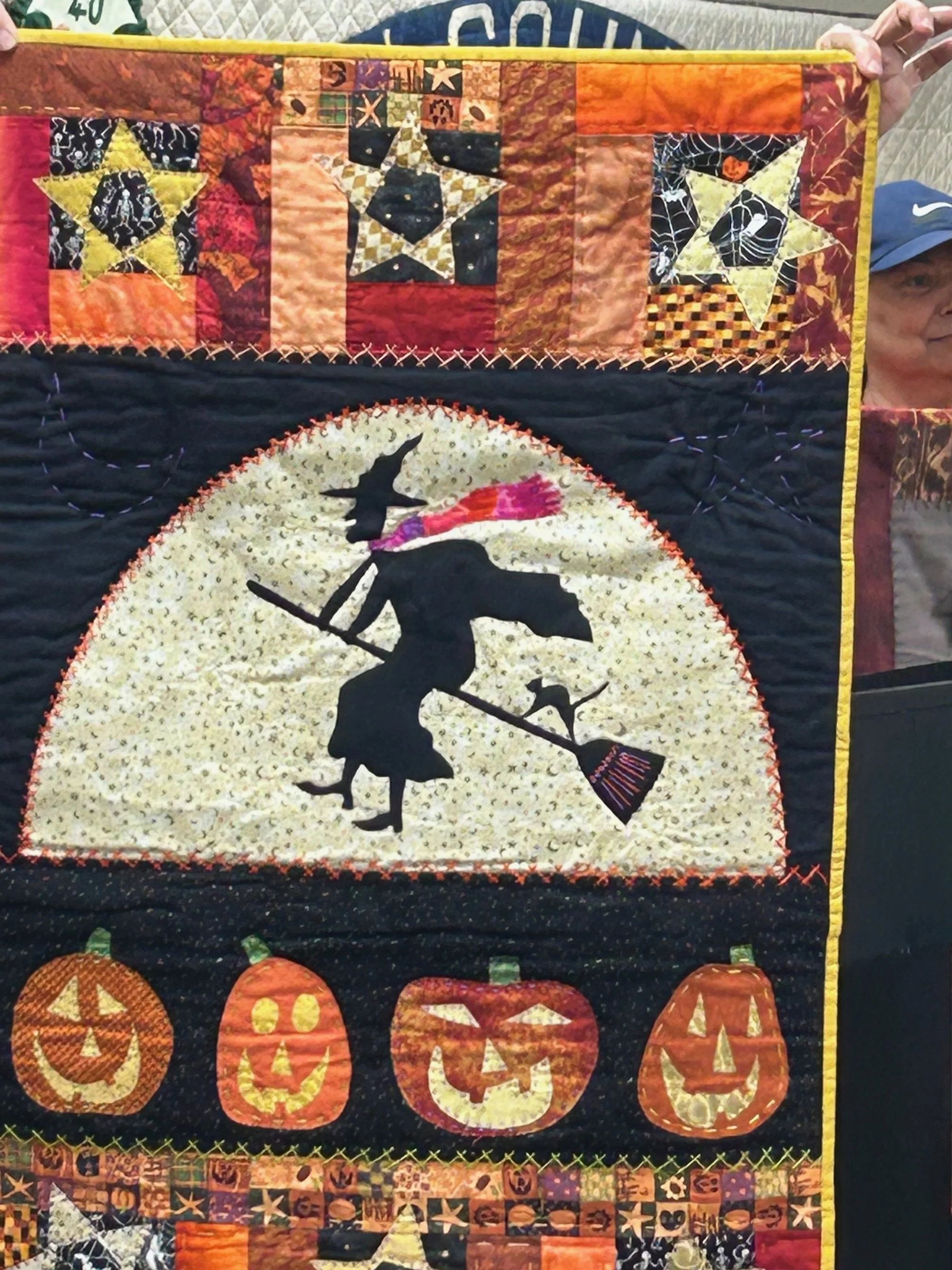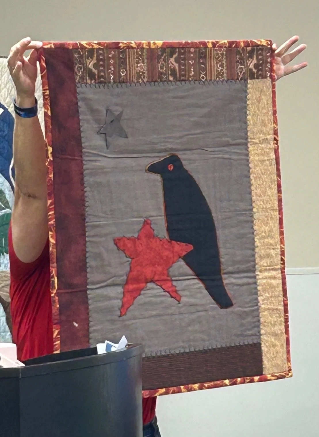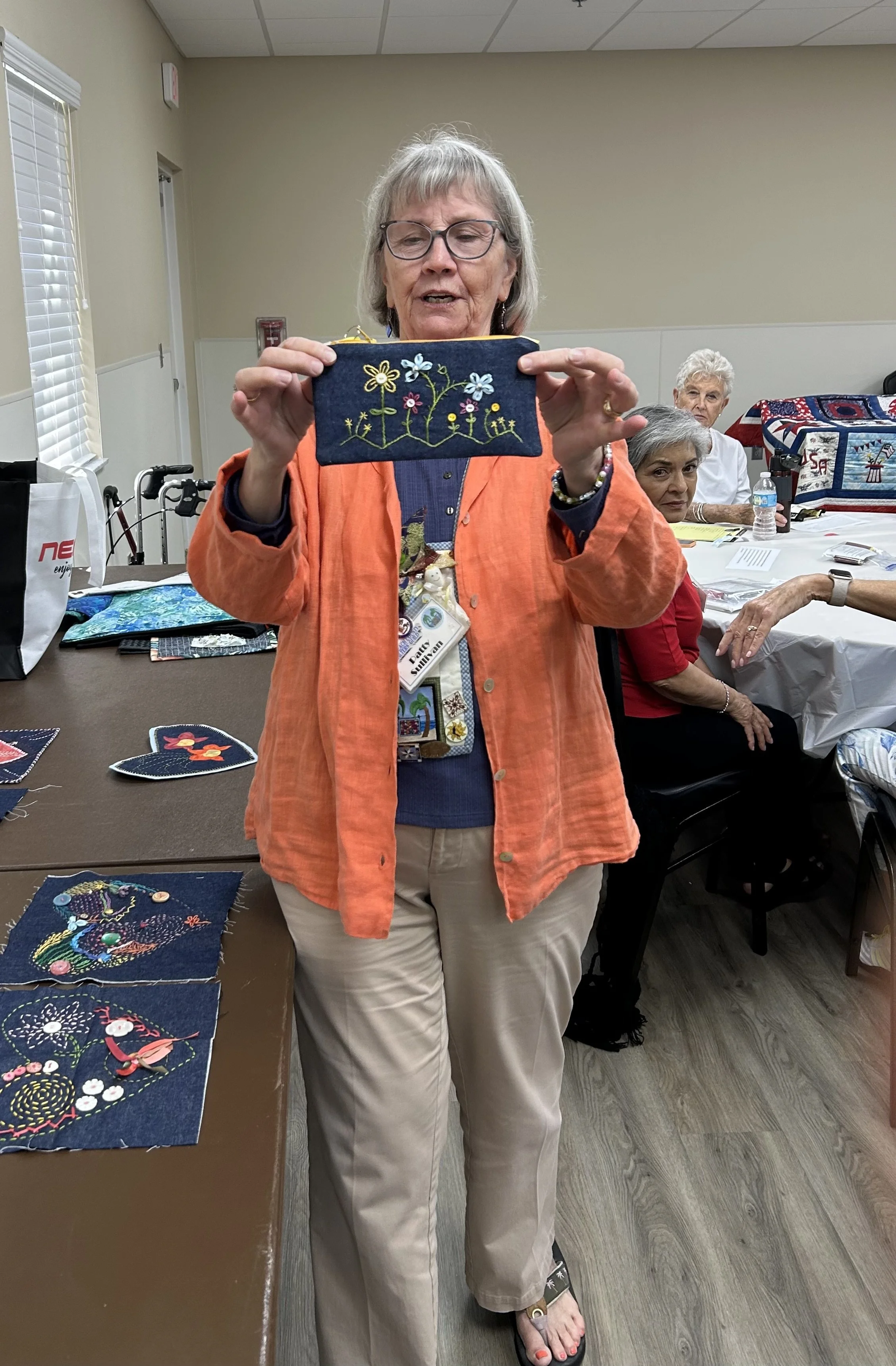 Karen Moore holds the quilt example for our upcoming January 2025 workshop • Saturday, 12/7